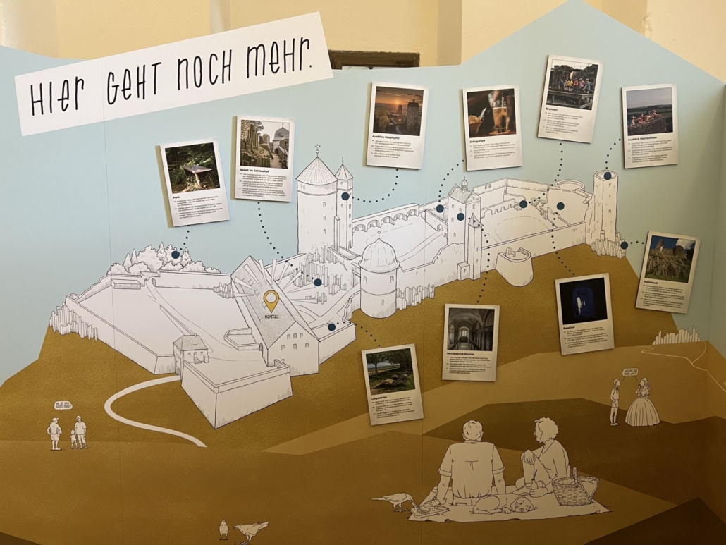 Der Raum eignet sich auch, um sich einen Überblick zu verschaffen – einerseits durch das Modell, aber auch durch kurze Texte und wenige Bilder, die zeigen, was es wo auf der Burg noch zu sehen gibt.
