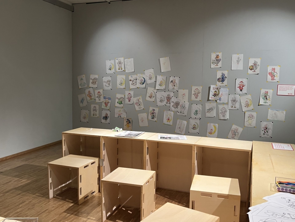 Im Untergeschoss geht es weiter mit der „Traumsandmühle“: Es warten zwei Räume, die den Ausflug wunderbar abrunden: Ein dunkler Raum mit drei Sofas und großer Leinwand, auf der eine Sandmann-Folge läuft – ein gemütlicher Rückzugsort, perfekt zum Runterkommen. Eine Kreativstation im Nachbarzimmer: An Holztischen und Sitzwürfeln wird gemalt, geklebt und gestaltet. Die Kinder bemalen Sandmann-Vorlagen und hängen ihre Werke an eine große Wand. Natürlich dürfen sie auch ein Ausmalbild als Andenken mit nach Hause nehmen.