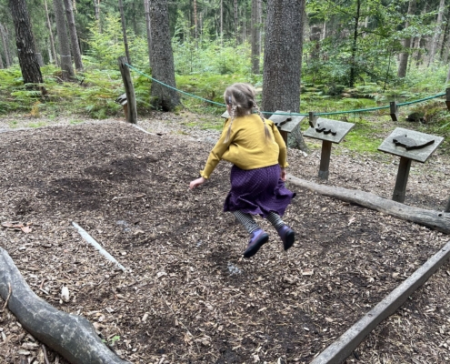 Der Familienerlebnisgarten bei den Springmäuschen ist ein ruhiger, naturbelassener Ort mit Klanggarten, Balancierpfaden, großen Kletterelementen und einer großen Rutsche (der Spielplatz ist zweigeteilt – verpasst ja nichts!). Kinder bewegen sich hier frei und entdecken Materialien und individuelle Spielgeräte.