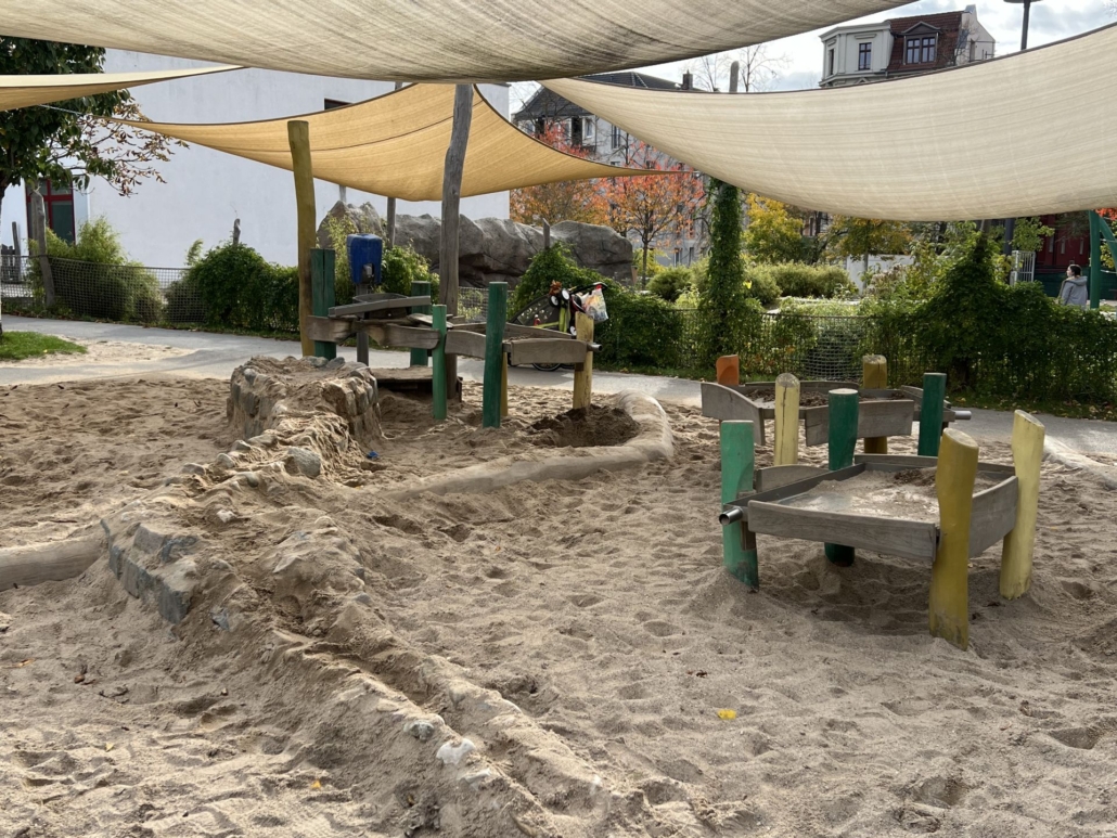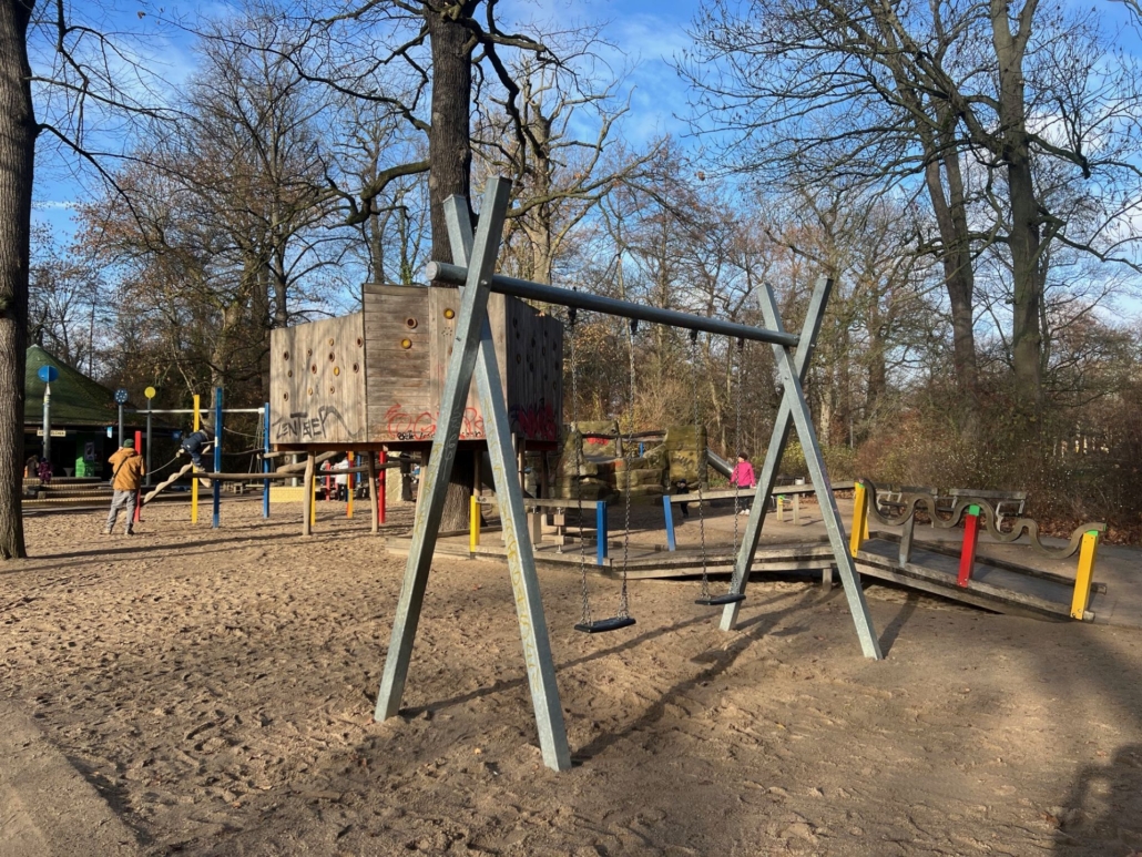 Dieser Spielplatz Rennbahnweg ist ein echtes Bewegungsparadies: verschiedene Rutschen, Gondeln, Doppelschaukeln, Röhren zum Klettern, Hüpfmatten, Drehteller und eine riesige Netzschaukel. Dazu ein separater Kleinkindbereich und Wasserspiele im Sommer – ein Traum für aktive Kinder.