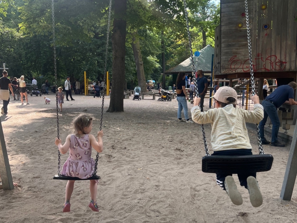 Ein fester Programmpunkt für uns danach: Eis von Il Buen Gelato. Ein Eis auf die Hand sorgt immer für neue Energie. Anschließend geht es entspannt am Kanal entlang. Boote beobachten, Enten zählen und einfach laufen – ohne Ziel, aber mit viel Zeit. Wer noch nicht nach Hause möchte, findet am Ende dieses kleinen Spaziergangs einen echten Geheimtipp: den Spielplatz An der Helmholtzschule. Das große Seil-Karussell, auf dem bis zu sieben Kinder gleichzeitig fahren können, ist ein Highlight. Dazu kommen viele weitere Spielmöglichkeiten und eine Doppelschaukel. Ein Ausflug, der Bewegung, Genuss und Stadtgefühl perfekt verbindet.