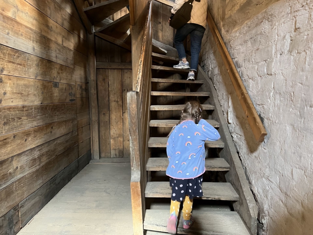 Zunächst geht es vorbei am Gestühl der beiden Glockenebenen, wo die mächtigen Kirchenglocken beeindruckend nah erlebt werden können – ein besonderer Moment für kleine und große Besucher:innen. Weiter oben wartet die Türmerwohnung, die noch heute mit Möbeln eingerichtet ist. Hier können Kinder sich gut vorstellen, wie einst der Türmer hoch über der Stadt lebte und arbeitete. Kaum zu glauben: Bis 1917 wohnte hier eine Familie, die zugleich als Feuerwache diente. Die alte Türmerwohnung ist unglaublich spannend – durch kleine Fenster blicken wir über die Dächer der Stadt.