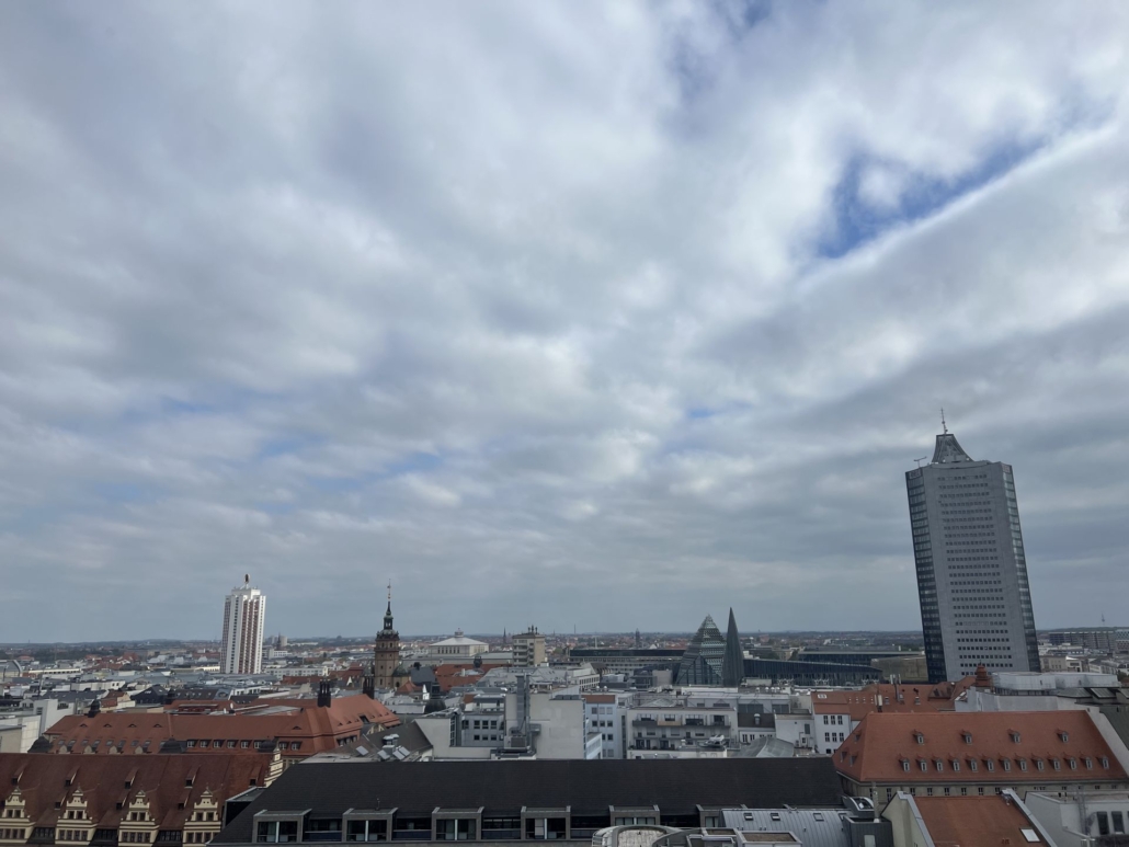 Oben angekommen belohnt uns ein weiter Blick über Leipzig. Wir spielen ein kindliches Spiel: Gebäude-Raten! Wer erkennt zuerst Oper, Völkerschlachtdenkmal, Neues Rathaus, Krochhochhaus mit Glockenmännern, Gondwanaland, Nikolaikirche, Altes Rathaus, Bundesverwaltungsgericht, Lutherkirche oder das RB-Fußballstadion?