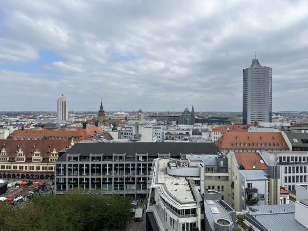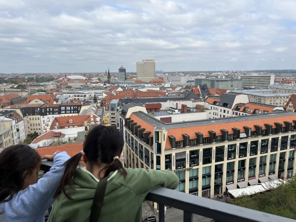 Nach dem letzten Treppenabschnitt öffnet sich schließlich der Blick: In 52 Metern Höhe liegt die Aussichtsplattform, von der aus sich ein weiter Rundblick über die Leipziger Innenstadt und darüber hinaus bietet. Der Aufstieg lohnt sich – nicht nur wegen der Aussicht, sondern auch wegen der spannenden kleinen Zeitreise auf dem Weg nach oben.