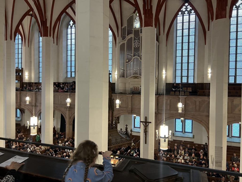Samstagnachmittag in Leipzig heißt: Motettenzeit! Für 3,00 EUR kaufen wir uns ein Programm und setzen uns auf die Empore in der Thomaskirche, um einen besonderen Blick auf die Thomaner zu erhaschen. Die Klänge füllen die Thomaskirche und für einen Moment sind auch die Kinder ganz still.