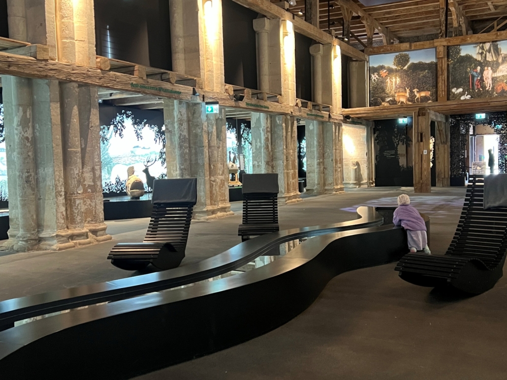 Im „Baumeister-Zimmer“ ist plötzlich Teamwork gefragt: ein Elternteil und ein Kind sägen gemeinsam an einem Baumstamm – auf der großen Leinwand wächst der Holzvorrat. Dann muss das Holz mit einem Kran per Handsteuerung verladen werden: ein Rad für die Richtung, eins für die Höhe. Anschließend werden Steine mit Hammer und Muskelkraft „gehauen“, ebenfalls aufgeladen und an die Festungsmauer befördert. Und wenn alles steht, regnet es virtuelles Konfetti – Jubel inklusive. Ein großartiger Spaß für die ganze Familie, der Geschichte greifbar macht! Wir haben nicht nur eine Mauer gebaut – „Können wir nochmal?“