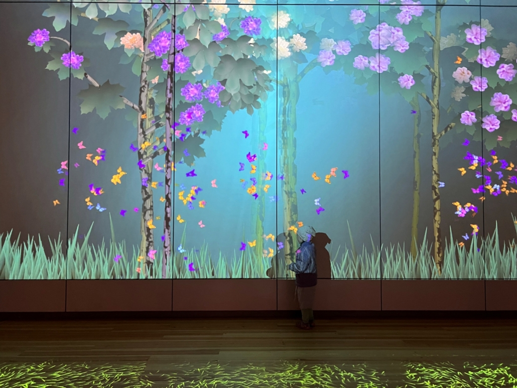 Einen kurzen Stopp legen wir in der Peterskirche ein, wo aktuell eine Sonderausstellung zu Gartenbaukunst vom Mittelalter bis ins 20. Jahrhundert (kostenpflichtig, Karten im Besucherzentrum bzw. Kommandantenhaus) gezeigt wird. Die Kleinen finden besonders die bunten Illuminationen toll: Auf einer riesigen digitalen Wand fangen sie virtuelle Schmetterlinge, und ihre Bewegungen hinterlassen farbige Spuren auf dem Boden. Ein schöner Zwischensprint gegen die Kälte. Mit 5 Jahren ist man offensichtlich noch zu klein für die Kameraerkennung bei diesem Spiel – „Hände hoch!“ – dann geht es. Fazit: Peterskirche kann man machen, muss man aber nicht.